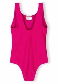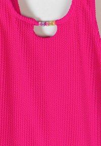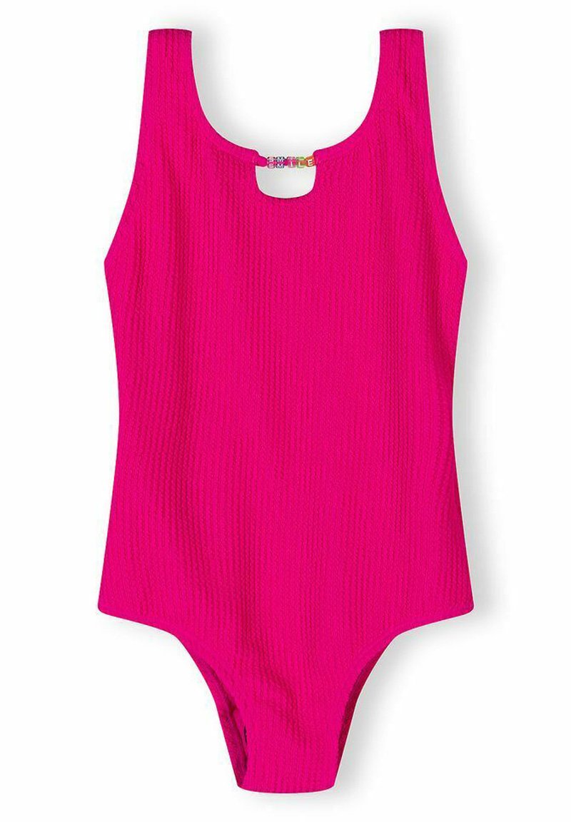 Maillot de bain sans manches rose vif avec tissu texturé et un petit détail de perles formant "SMILE" au niveau de l'encolure découpée à l'avant.