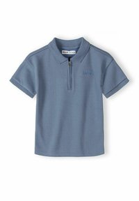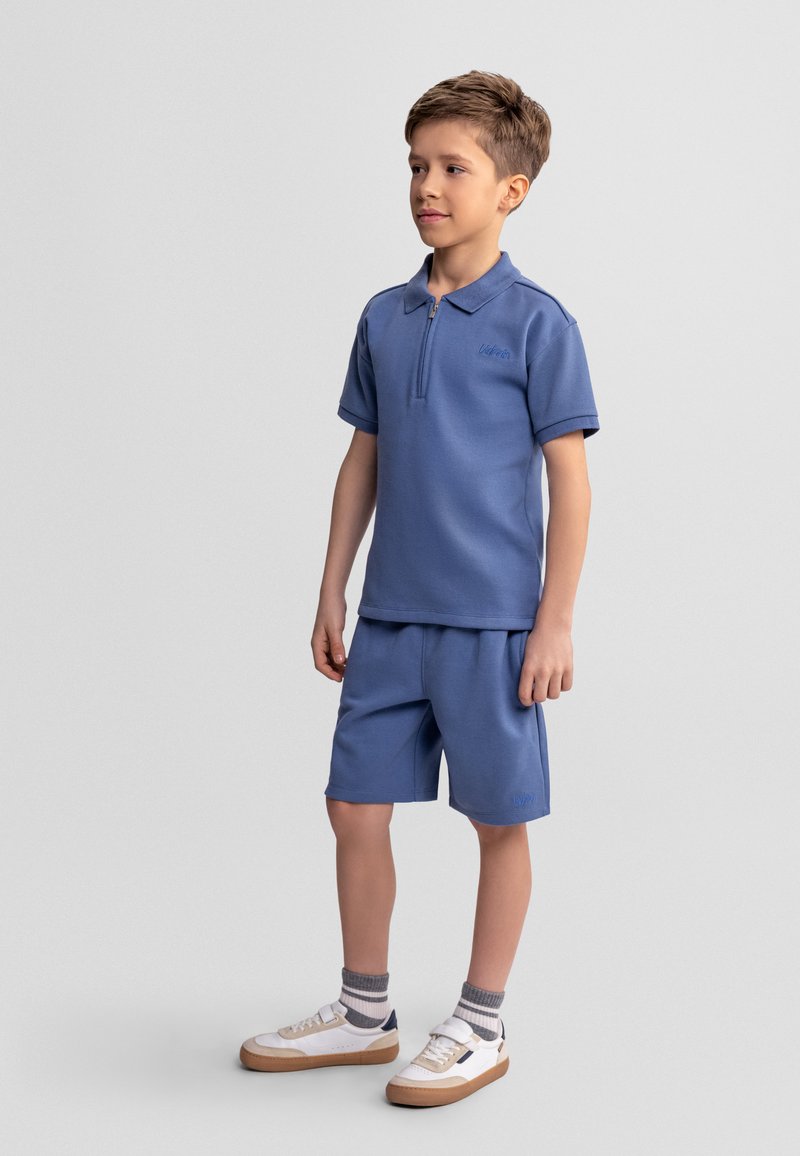 Garçon debout portant un polo à manches courtes bleu avec fermeture éclair et un short assorti, des chaussettes rayées et des baskets blanches sur un fond uni.