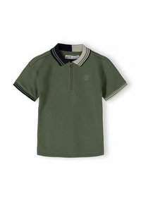 Jeune garçon debout, portant un polo vert à manches courtes avec col bleu marine et blanc, un short vert assorti, des chaussettes blanches et des baskets beiges.