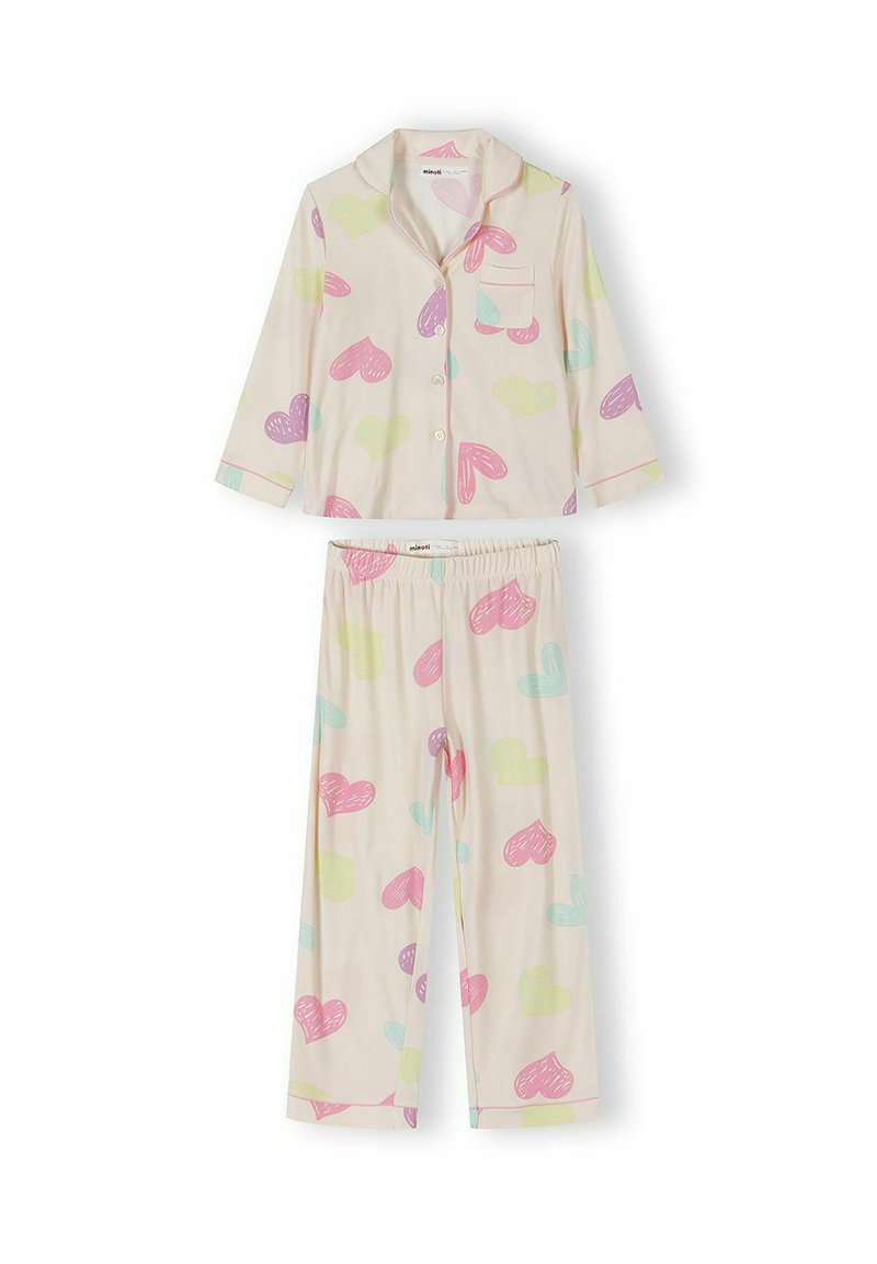 Pyjama deux pièces pour enfants avec manches longues et pantalon, orné de motifs de cœurs roses, violets, bleus et verts sur un tissu beige clair.