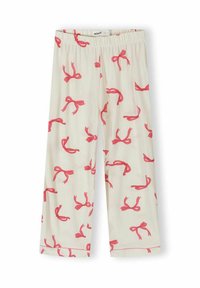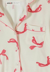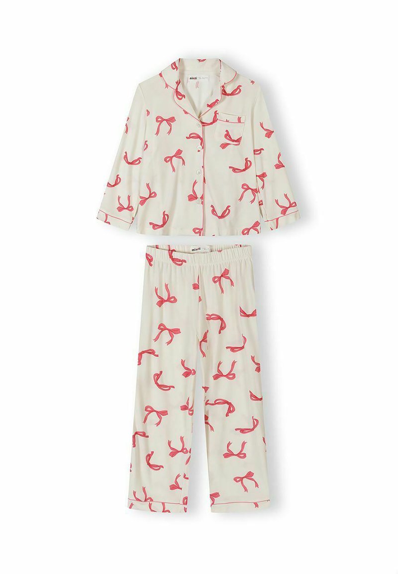 Ensemble de pyjama manches longues couleur crème avec motifs de nœuds rouges, haut boutonné avec col et poche, et pantalon à taille élastique.