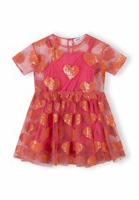 Fille souriante, portant une robe rose vif avec des cœurs en sequins orange et des baskets blanches, debout devant un fond uni.