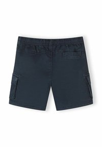 Deux paires de shorts cargo pour enfants, une bleu marine et une gris clair, avec des tailles élastiques et des fermetures à cordon de serrage.