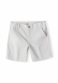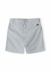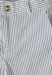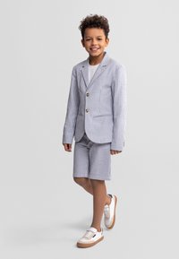 Enfant souriant marchant vers l'avant, portant un blazer rayé bleu et blanc et un short assorti, avec des baskets blanches et une chemise blanche unie.