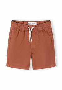 Trois paires de shorts à taille élastique avec cordons de serrage en rouille, blanc et marine, présentées empilées sur un fond blanc.