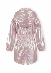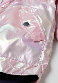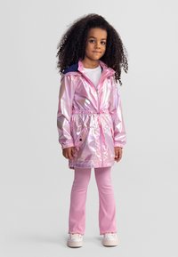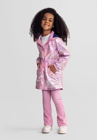 Fille aux cheveux bouclés portant un imperméable à capuche rose brillant, un pantalon rose et des baskets blanches, debout devant un fond uni.