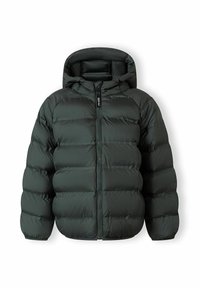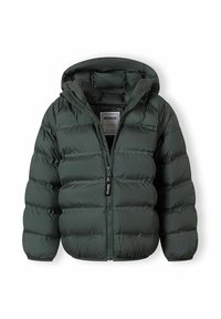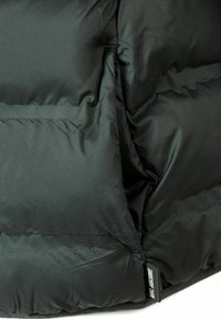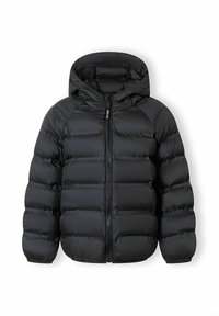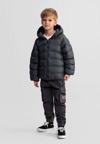 Jeune garçon debout portant une doudoune noire avec capuche, un pantalon cargo foncé et des baskets noires à lacets blancs sur un fond gris uni.