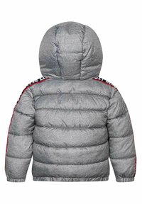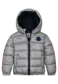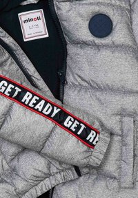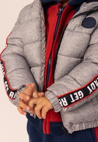Veste matelassée grise avec des accents rouges et du texte. En dessous, un hoodie rouge à zip. Pantalon bleu visible en bas, mains jointes.