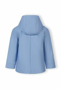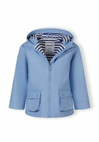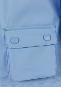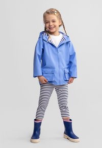 Fille souriante aux cheveux tressés portant un imperméable bleu, des leggings rayés et des bottes de pluie bleues sur un fond gris clair.
