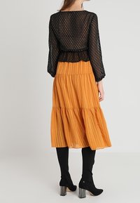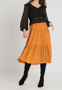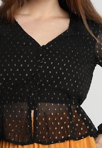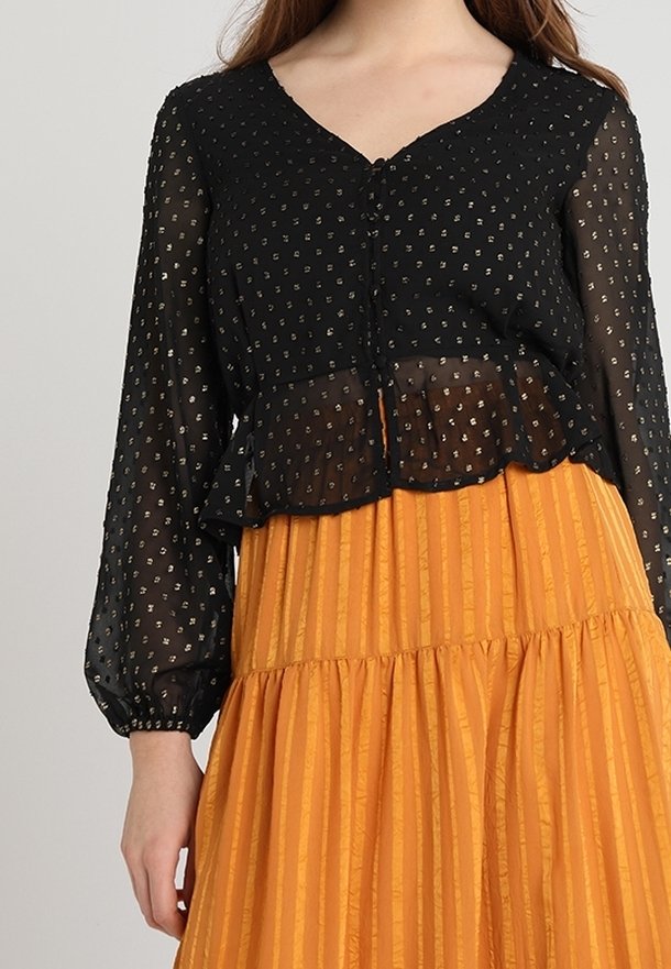 Femme portant un chemisier noir transparent à manches longues avec des accents dorés et des boutons sur le devant, associé à une jupe plissée orange taille haute.