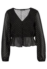 Blouse noire transparente avec des pois blancs, manches bouffantes et poignets à volants. Le tissu est léger et fluide. Encolure ronde simple.