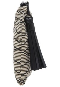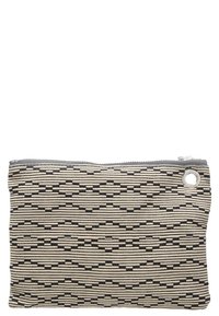 Pochette en tissu rayé noir et beige avec fermeture éclair, dotée d'une lanière noire pour poignet et d'un pompon décoratif sur le côté.