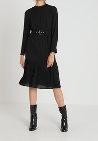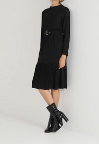 Robe noire à manches longues avec une jupe plissée, dotée d'une taille cintrée avec une ceinture. Associée à des bottines noires brillantes.