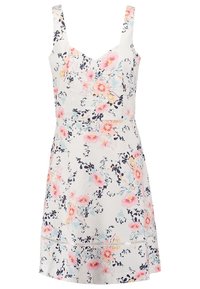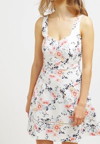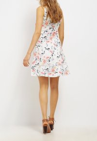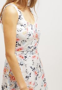 Robe fleurie avec un corsage ajusté et une jupe évasée. Le tissu blanc présente des fleurs roses et bleues, une finition texturée et de larges bretelles.