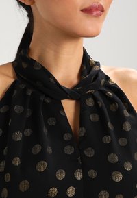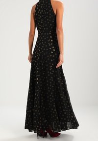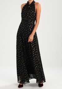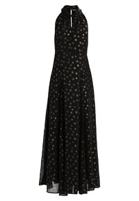 Robe maxi noire avec des pois dorés, col halter et détail à nouer, jupe fluide, tissu transparent, associée à des talons bordeaux.