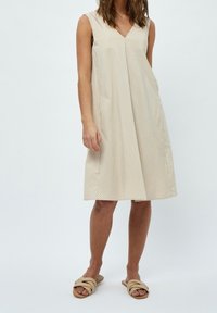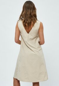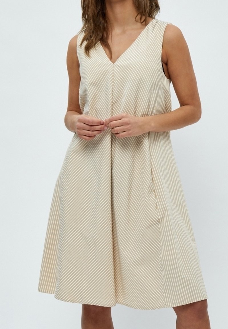 Robe sans manches beige avec des rayures blanches verticales, décolleté en V et jupe évasée. Fabriquée en tissu doux avec une texture subtile.
