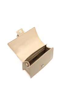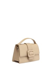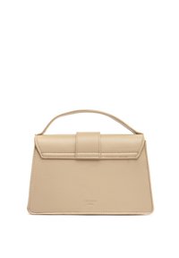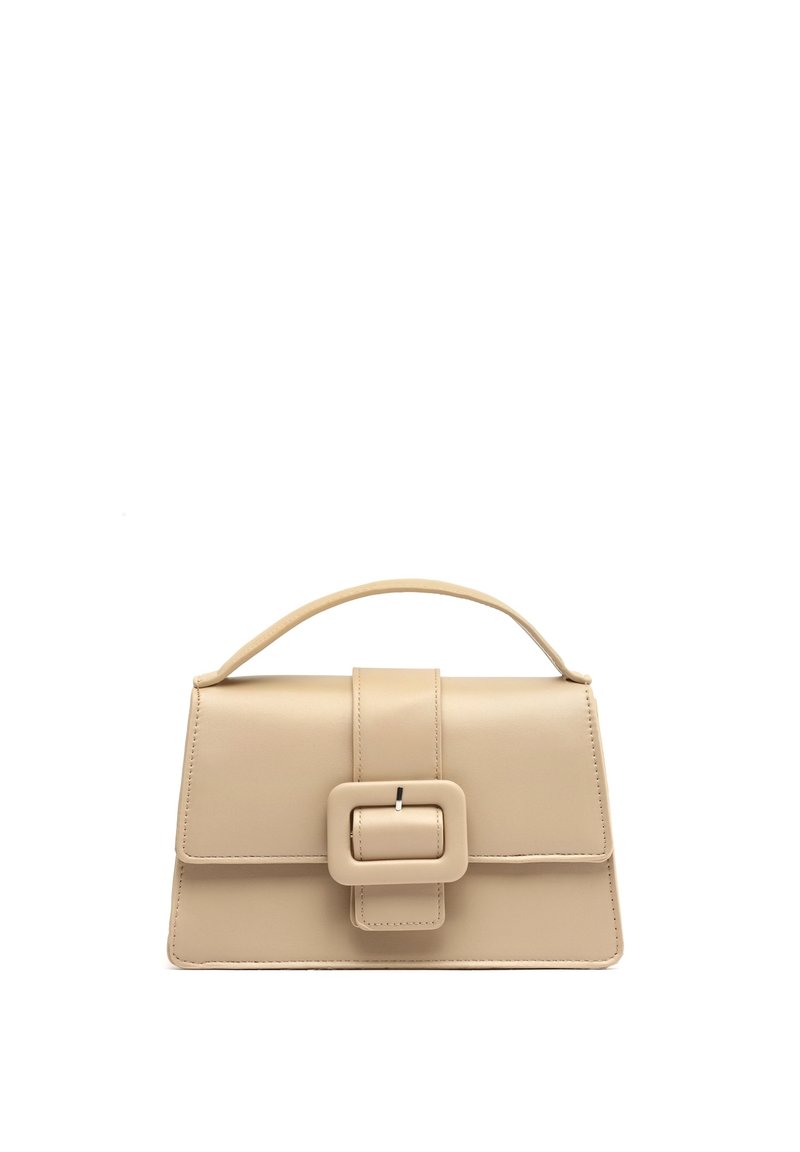 Sac à main rectangulaire beige avec une poignée supérieure et une grande boucle carrée sur le rabat avant.