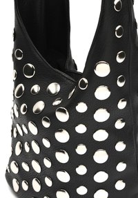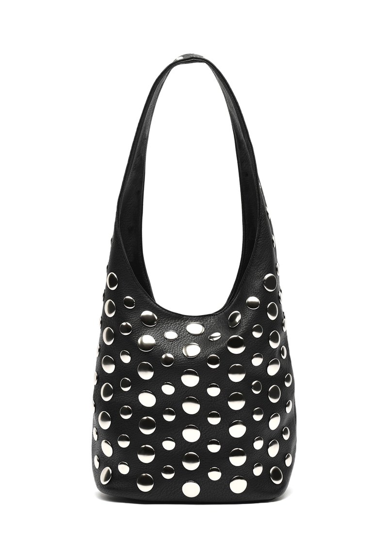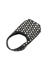 Sac à main en cuir noir avec de grandes découpes circulaires et des accents métalliques circulaires. Bretelle incurvée et forme style hobo.