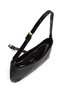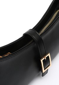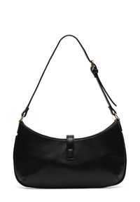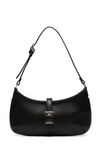 Sac à bandoulière en cuir noir avec bandoulière réglable et détail boucle à l'avant, posé sur un fond blanc.