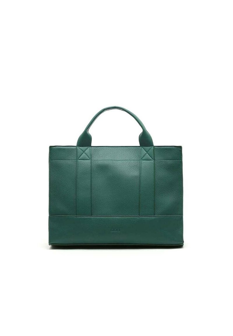 Sac fourre-tout rectangulaire en cuir vert foncé avec deux poignées et coutures renforcées sur fond blanc.