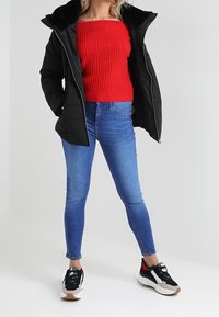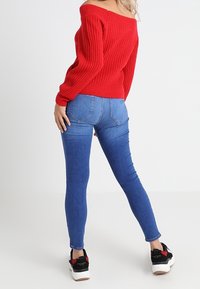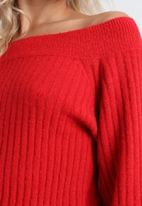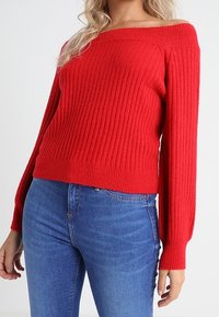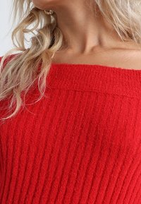 Pull rouge en maille côtelée avec un design épaules dénudées. Manches longues et ajustées et un ourlet court complètent un jean skinny bleu.