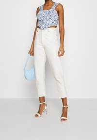 Femme portant un haut floral bleu marine à épaules dénudées avec des manches longues, rentré dans un jean bleu taille haute.
