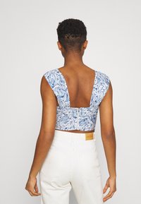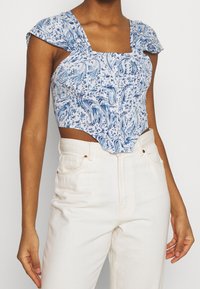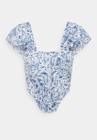 Top court à imprimé floral en bleu et blanc, avec un décolleté carré et de courtes manches gigot, réalisé dans un tissu léger.