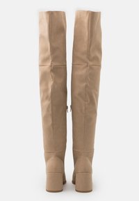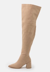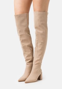 Bottes beige en daim montant jusqu'au genou, de texture lisse, avec un bout pointu et un talon bloc. Dotées d'une fermeture éclair latérale pour un enfilage facile.
