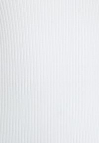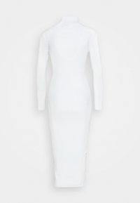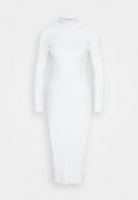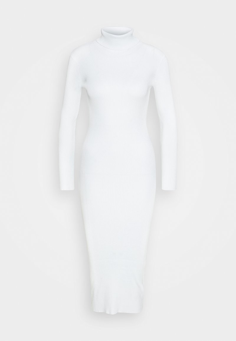 Robe midi en maille côtelée blanche avec manches longues et col roulé, silhouette ajustée, présentée sur un fond uni.