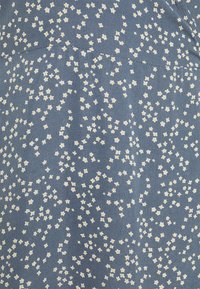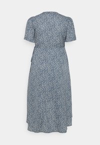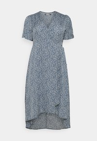 Robe midi bleue à manches courtes, présentant un motif floral et un ourlet plongeant. Fabriquée en tissu léger et fluide.