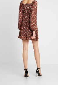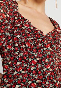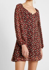 Robe florale avec un décolleté en V, des manches longues bouffantes et une jupe évasée. Le tissu est léger avec un motif rouge, blanc et vert. Sac à main noir.