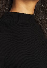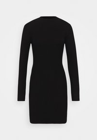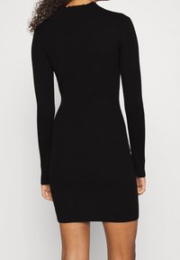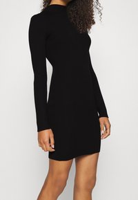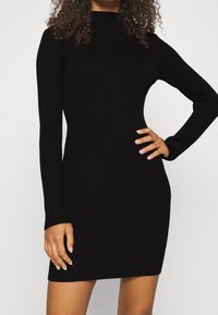 Robe noire à manches longues en côte, avec un col montant et une silhouette ajustée, longueur genou, présentant une texture subtile et sans motifs visibles.