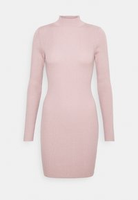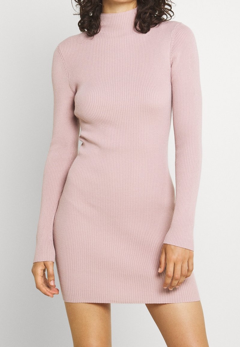Femme portant une robe mini en tricot côtelé rose ajustée à manches longues, se tenant contre un fond gris clair uni.