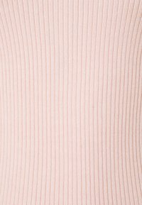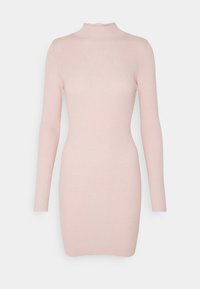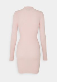 Robe tricotée à manches longues de couleur rose clair avec un col montant et une silhouette ajustée, présentant une texture côtelée sur toute la surface.