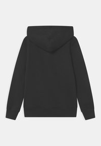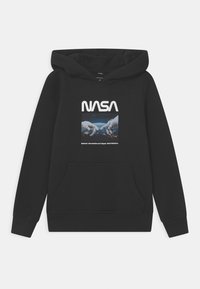 Sweat à capuche noir avec une poche avant, comportant un logo NASA et une impression graphique de mains tendues vers la Terre. Matériau en coton, design à enfiler.