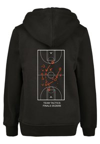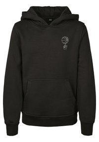 Sweat à capuche noir en tissu doux, avec une poche sur le devant, des poignets côtelés et un graphique blanc représentant une main tenant un ballon de basket.