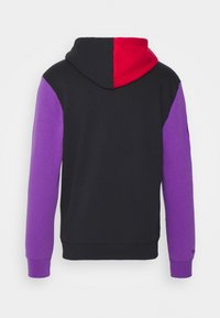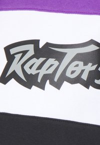 Sweat à capuche avec manches et capuche violettes, corps inférieur noir, bloc diagonal rouge et blanc sur la poitrine, et logo "Raptors" sur un panneau blanc.