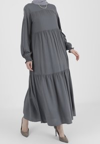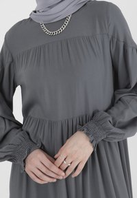 Robe grise longue et à plusieurs niveaux en tissu doux, dotée de manches ballons et d'une coupe décontractée. Accentuée d'un collier en chaîne.