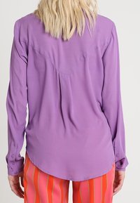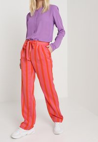 Femme portant un chemisier violet à manches longues, rentré dans un pantalon taille haute rose avec des rayures verticales orange et une ceinture nouée.