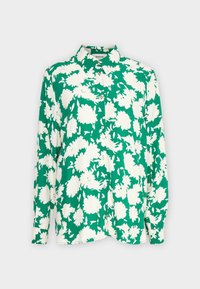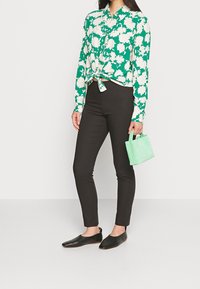 Femme portant un chemisier vert à boutons avec un grand motif floral blanc et un pantalon noir, debout les bras détendus le long du corps.