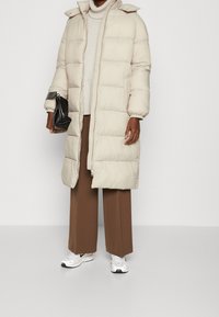 Personne portant un long manteau matelassé beige avec capuche, un pantalon large marron et des baskets blanches, debout devant un fond uni.