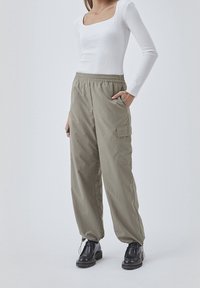 Personne portant un haut blanc à manches longues ajusté, un pantalon cargo ample vert olive avec des chevilles élastiques, et des chaussures noires à lacets, debout avec la main dans la poche.
