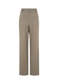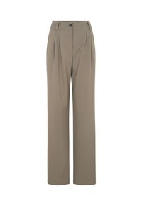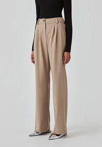 Pantalon beige ajusté à taille haute avec plis sur le devant et fermeture par boutons, associé à des chaussures métalliques à bout pointu et un haut noir côtelé.