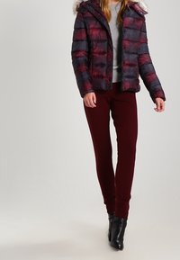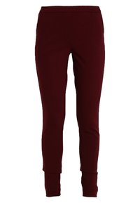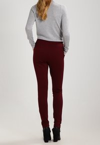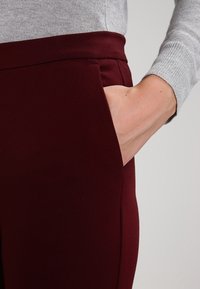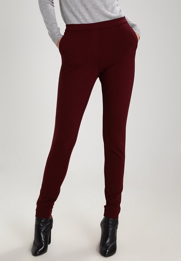 Pantalon sur mesure bordeaux en tissu lisse, coupe fuselée, avec poches latérales, associé à des bottes à talons noires.