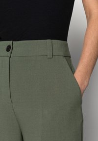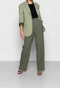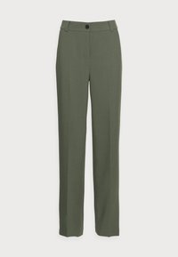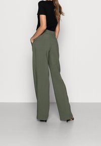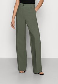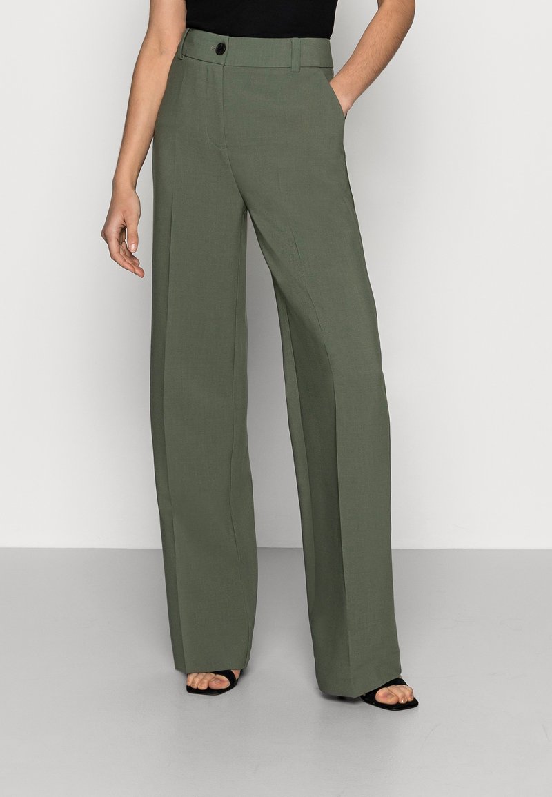 Pantalon taille haute à jambes larges en tissu vert olive. Comprend des poches latérales, un pli avant et une fermeture à un bouton. Texture lisse.
