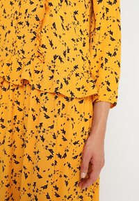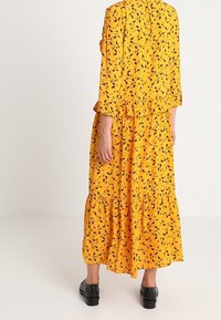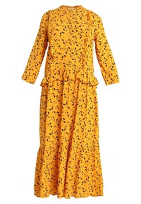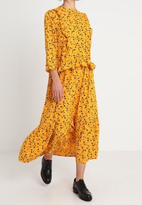 Femme portant une robe longue à manches longues jaune à fleurs avec des volants, associée à des chaussures Oxford noires à lacets, se tenant sur un fond blanc uni.
