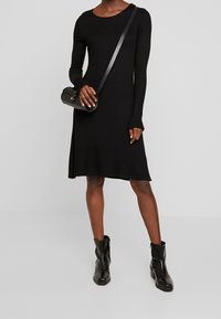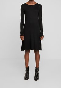 Robe noire à manches longues avec un col rond, un corsage ajusté et une jupe évasée. Confectionnée en matière côtelée, associée à des bottines noires.