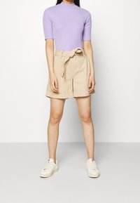 Haut côtelé à manches courtes lavande associé à un short taille haute beige avec un détail de nœud à la taille et des poches latérales.