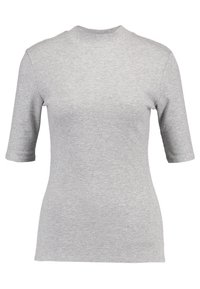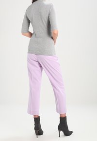 Haut côtelé gris à col montant, associé à un pantalon violet clair avec un bouton et des poches latérales.