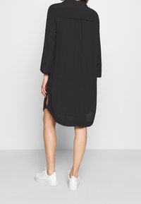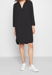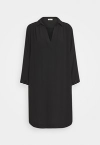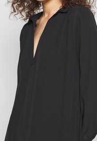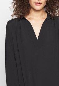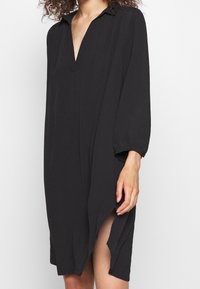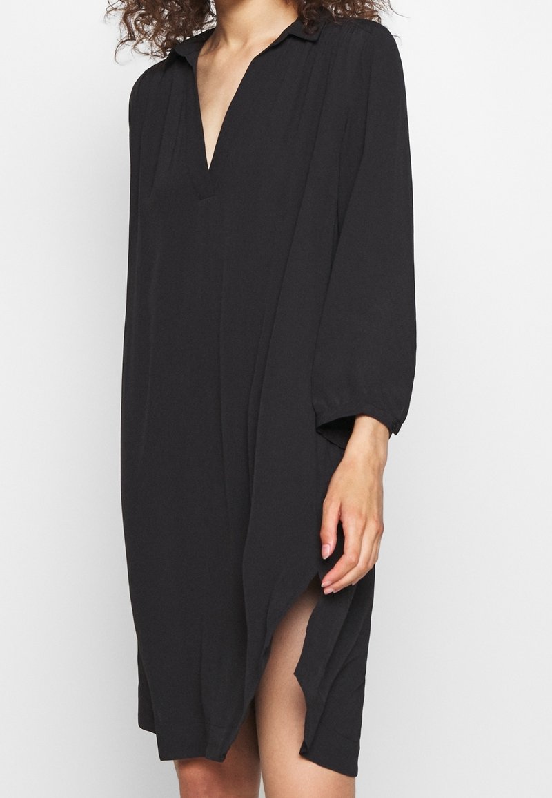 Robe noire ample avec col, décolleté en V profond et manches longues. Présente des fentes latérales pour plus de liberté de mouvement et une texture lisse.